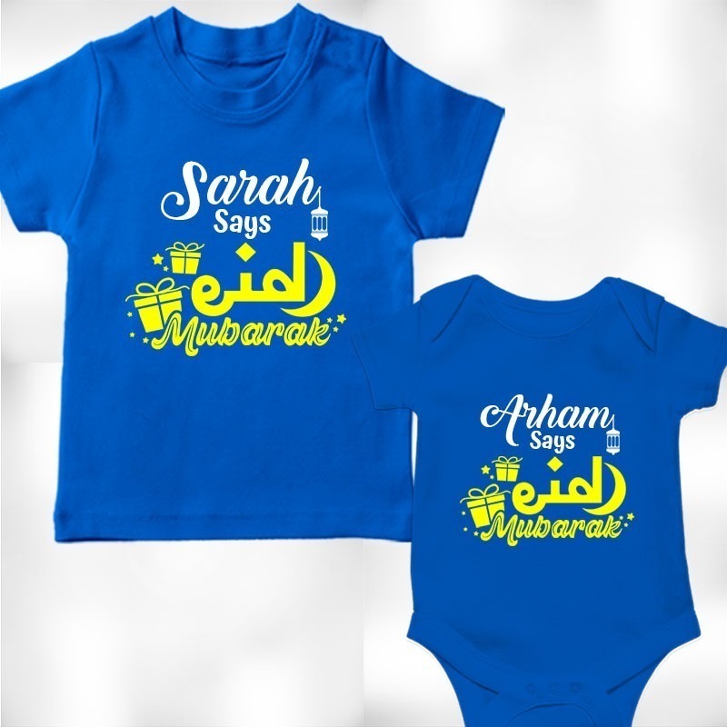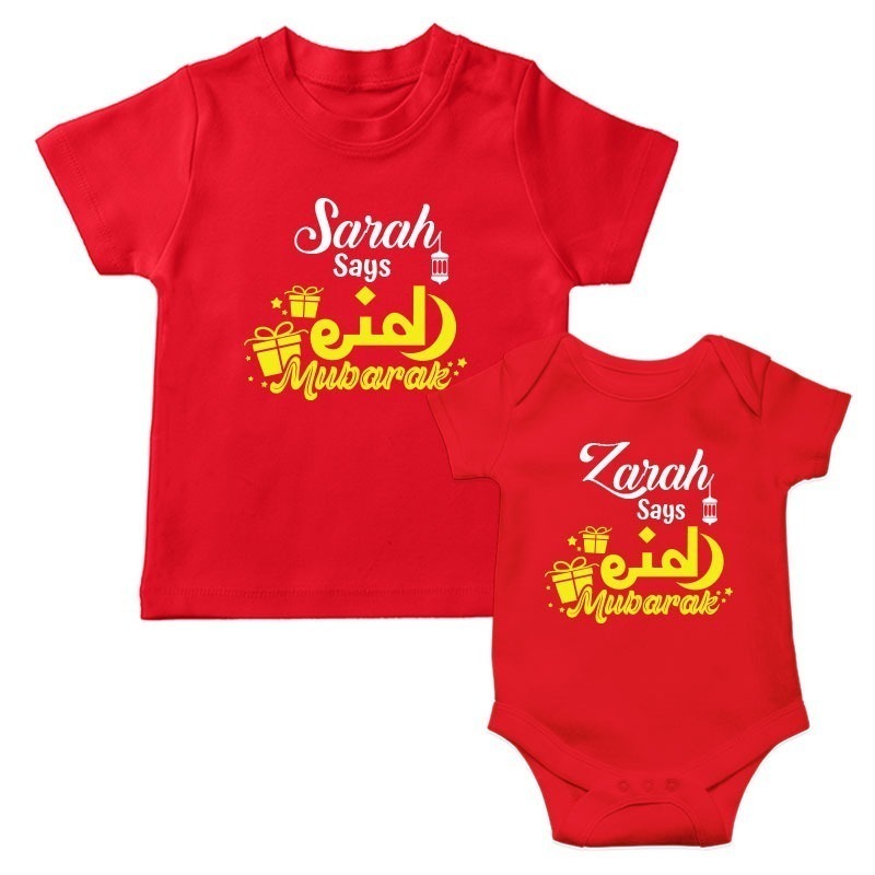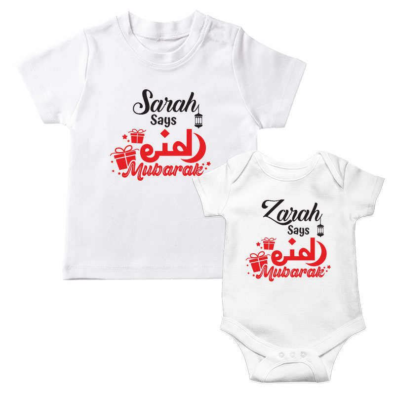 Kid says Eid Mubarak Matching Design T-shirt and Romper for Sibling